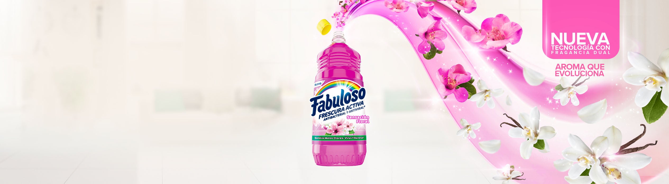 Fabuloso Sensación Floral es un limpiador desinfectante multiusos con una nueva tecnología de fragancia dual que te proporciona un aroma que evoluciona a lo largo del día y te brinda una sensación floral y de frescura por hasta 24 horas*.